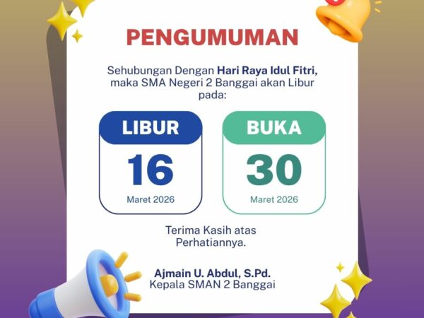 Kolom ini didedikasikan untuk mengapresiasi pencapaian gemilang siswa-siswi SMA Negeri 2 Banggai. Mari bersama kita rayakan setiap prestasi, dari akademik hingga non-akademik, yang telah mengharumkan nama sekolah.
